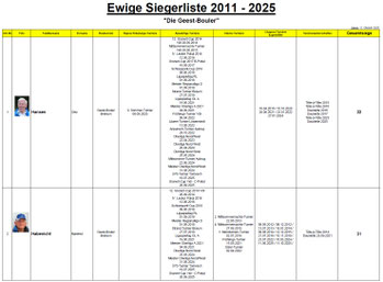 Die erreichten Platzierungen (soweit bekannt) ergeben sich aus der rechten Spalte.