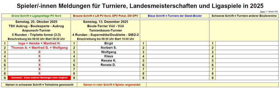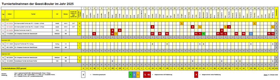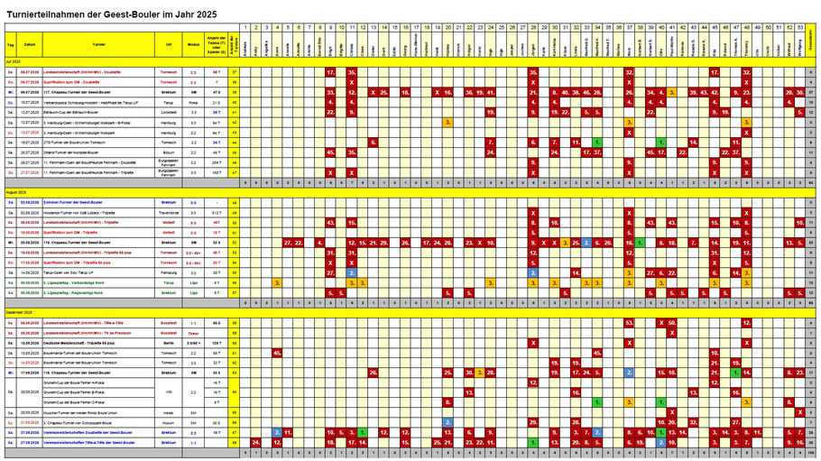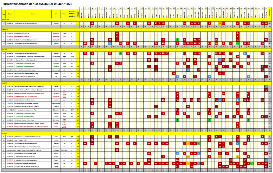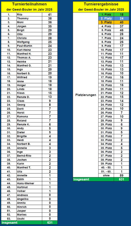 Insgesamt 256 x nahmen Geest-Bouler im Jahr 2017 an Turnieren und Meisterschaften teil. Spitzenreiterin war Anne mit 28 Teilnahmen, knapp gefolgt von Karl-Heinz (22) und Otto (20). Bei vier Turnieren wurden die Geest-Bouler von Spielern anderer Vereine unterstützt.
