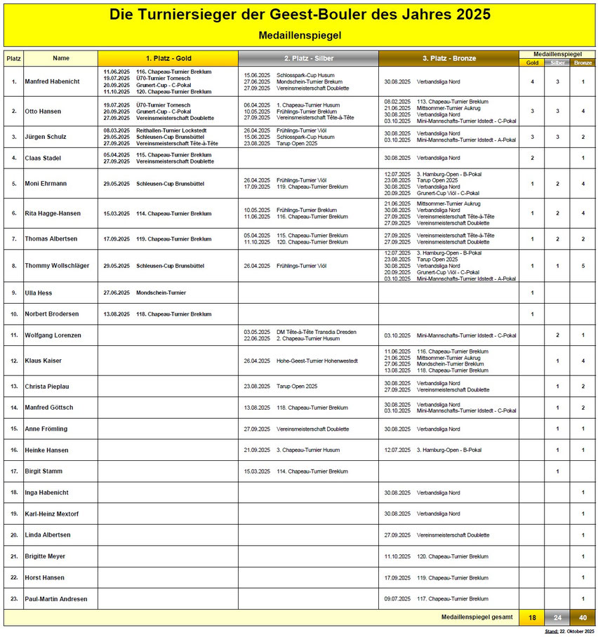 Aufgrund der im Jahr 2020 herrschenden Corona-Pandemie nahmen Geest-Bouler im Jahr 2020 nur 127 x an Turnieren und Meisterschaften teil. Im vergangenen Jahr 2019 waren es 285 Turniere und Meisterschaften. Spitzenreiter ist Justin mit 7 Teilnahmen, knapp gefolgt von Inga, Johannes, Karl-Heinz, Klaus, Otto und Renate K. mit je 6 Teilnahmen.