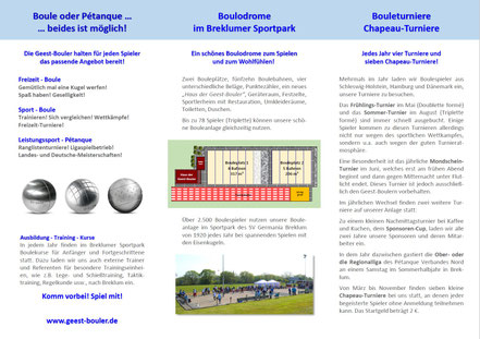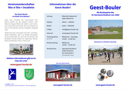Druckfrisch ist die 8. Auflage des Flyers der Geest-Bouler am 21. März 2020 ausgeliefert worden. Der Flyer wurde von Inga und Manfred modern gestaltet und der aktuellen Situation der Boulesparte angepasst. Wir hoffen, dass er bei Euch Anklang finden wird.