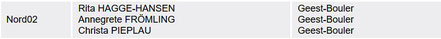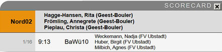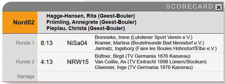 Aufgeteilt in 16 Poules wurde die Vorrunde gespielt. Die drei Geest-Boulerinnen mussten als Team „Nord02“ gegen die Teams „Niedersachsen 04“ und „Nordrhein-Westfalen 15“ antreten. Beide Spiele gingen mit 8:13 und 4:13 leider verloren. Somit blieb nur das B-Finale mit 32 Teams im KO-System.