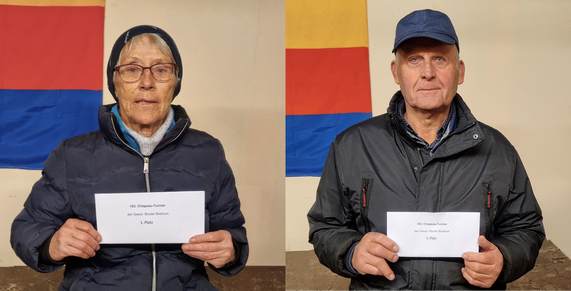Am besten kamen Renate Dyck und Manfred Göttsch (beide Geest-Bouler Breklum) mit den Boden- und Lichtverhältnissen zurecht. Beide gewannen ihr drei Spiele und brachten aus jedem Spiel im Durchschnitt 9 Pluspunkte mit. Selbst aufgrund des persönlichen Vergleichs konnte zwischen den beiden Spielern kein Unterschied festgestellt werden. Beide Spieler wurden daher zum Turniersieger erklärt. Das hatte es bei den vorangegangenen 102 Chapeau-Turnieren so auch noch nicht gegeben!