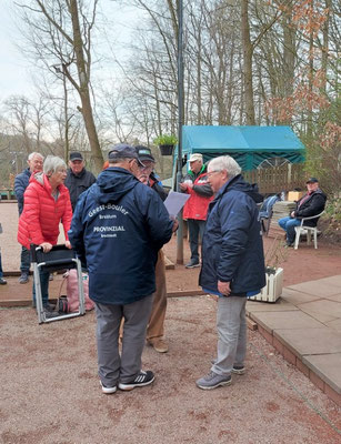 Die Boulespieler*innen wurden von Wulf von Soosten (Spartenleiter), Ecki Schilling (Organisation) und Nico Dziecielski (Turnierleitung) nach zwei Coronajahren freudig in Oelixdorf begrüßt.
