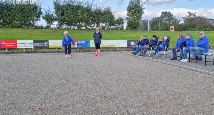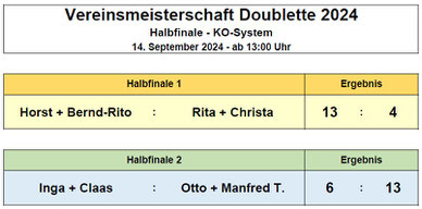 Ebenfalls im Halbfinale vertreten war der „Vereinsmeister Doublette 2016 und 2017“ mit Otto Hansen und Manfred Thomsen. Auch die „Vereinsmeisterin Doublette 2023“, Rita Hagge-Hansen, mit neuer Spielpartnerin Christa Pieplau, trat im Wettkampf der letzten 4 Teams an. Das vierte Team im Halbfinale war in dieser Zusammenstellung bisher noch nie am Start gewesen. Inga Habenicht und Claas Stadel, die 56 Lebensjahre voneinander trennen, hatten das Halbfinale mit eindeutigen Siegen ebenfalls erreicht.