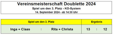 Und so kam, was kommen musste! Punkt für Punkt schoben sich Inga + Claas immer weiter an das Ergebnis von Rita + Christa heran. Vor der letzten Aufnahme stand es aber immer noch 12:10 für Rita + Christa. Doch eine 3-Punkte-Aufnahme reichte Inga und Claas zum 3. Platz in der Vereinsmeisterschaft Doublette 2024 und damit auch zur Bronzemedaille.