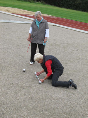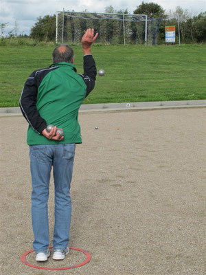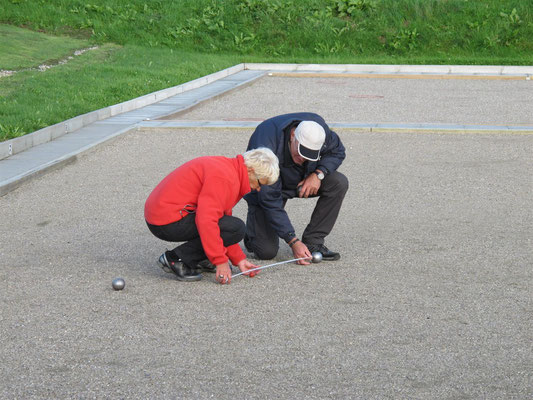 Das Endspiel sollte aber noch spannender werden. Auch hier ging zuerst Jochen Hess mit 5:0 Punkten schnell in Führung bevor Inga Habenicht den ersten Punkt machen konnte. Er baute seinen Vorsprung dann immer weiter mit hervorragenden Würfen auf 10:3 aus. Doch die Vorjahresmeisterin wollte sich nicht geschlagen geben. Punkte für Punkt kämpfte sie sich heran und konnte nach einem 10:10 sogar mit einem Punkt zum 10:11 in Führung gehen. Doch auch Jochen Hess aktivierte noch einmal alle spielerischen Kräfte und seine volle Konzentration. Nach einer weiteren Aufnahme stand es 12:11 für ihn. Nur noch ein Punkt trennte ihn noch vom Titel des Vereinsmeisters 2013. Doch er zeigte Nerven. Seine Kugeln landeten in der letzten Aufnahme zwar in der Nähe der Zielkugel (Schweinchen) aber nur an zweiter, dritter und fünfter Stelle. Inga Habenicht hatte aber auch nur eine Kugel am Schweinchen platzieren können und somit bis dahin nur einen Punkt sicher. Ihre dritte und letzte Kugel musste sie also so millimetergenau zwischen ihrer eigenen Kugel und der ihres Gegners platzieren, um das Spiel zu gewinnen.